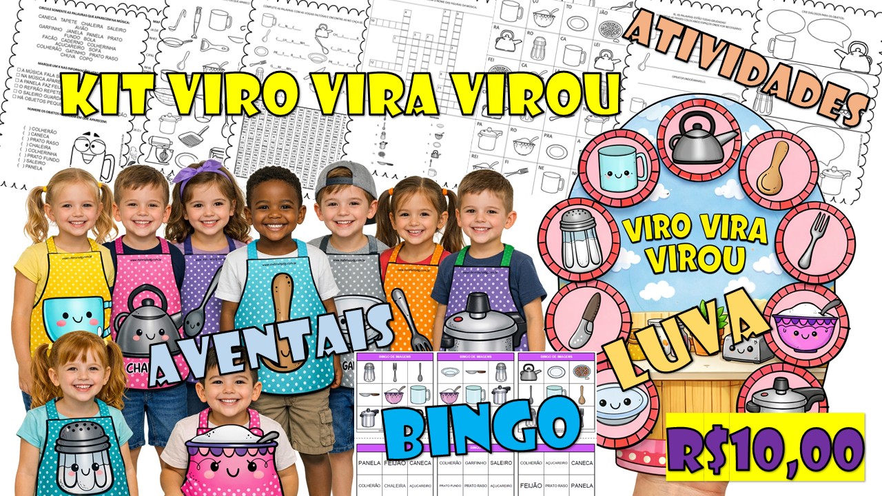 Kit Viro Vira Virou – Atividades, Luva, Aventais e Bingo